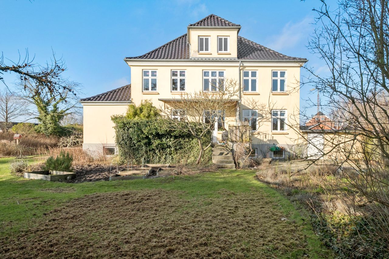 Ejendommen er opført i 1917 som to familiers direktørbolig, og tankerne lader sig hurtigt falde på en palæagtig ejendom med karakter, æstetik og klassiske rammer. Ejendommen byder på en imponerende trappeopgang, to store stuer med brændeovn, bibliotek, stort køkken/alrum, minimum fem gode soveværelser, to badeværelser samt stor kælder med underjordisk garage.