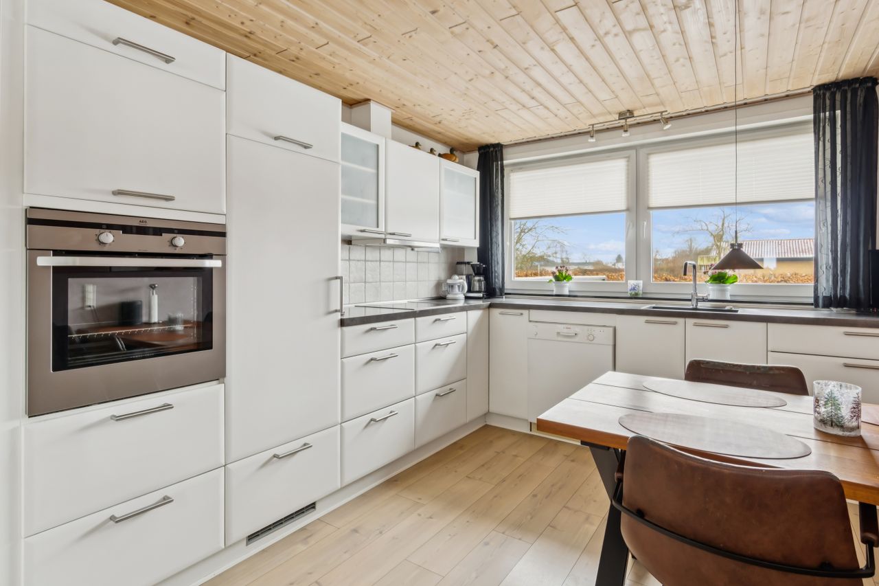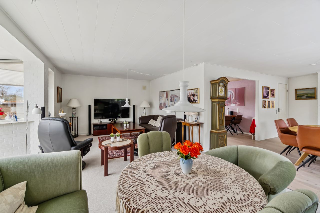 Indretningen byder på lys, åben entré, funktionelt bryggers, fire værelser, en vinkelstue med brændeovn og udgang mod syd til haven, lyst køkken med mindre spiseplads, flot tidløst badeværelse med gulvvarme samt gæstetoilet.